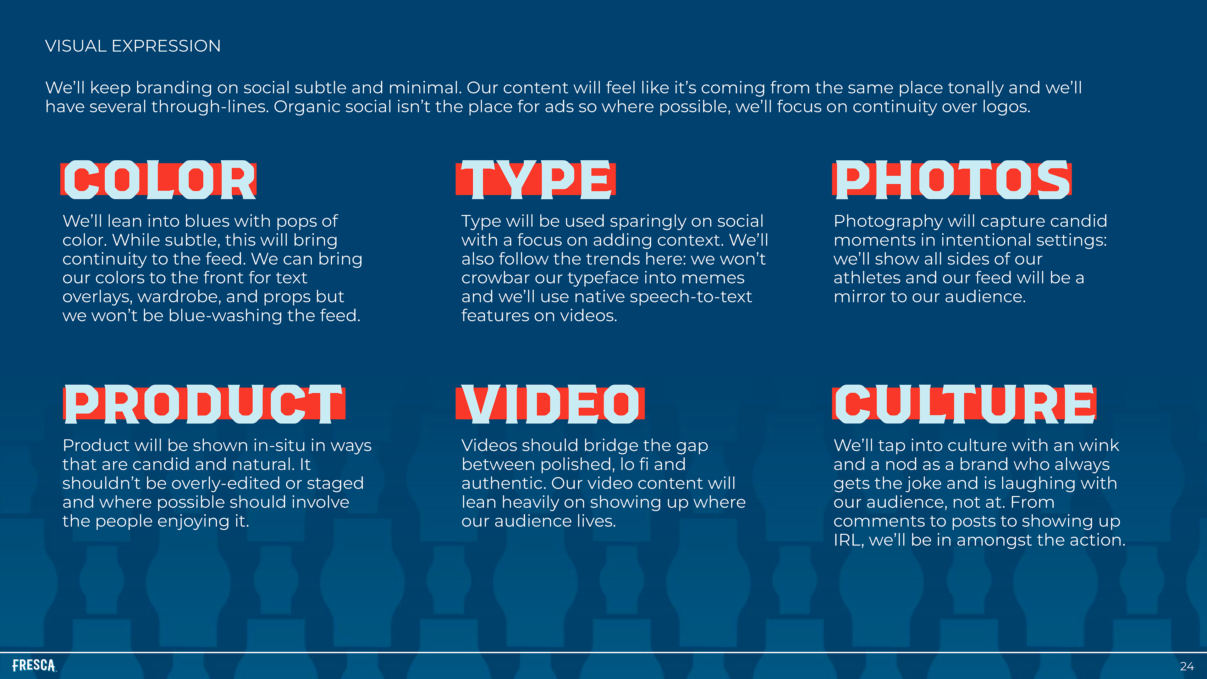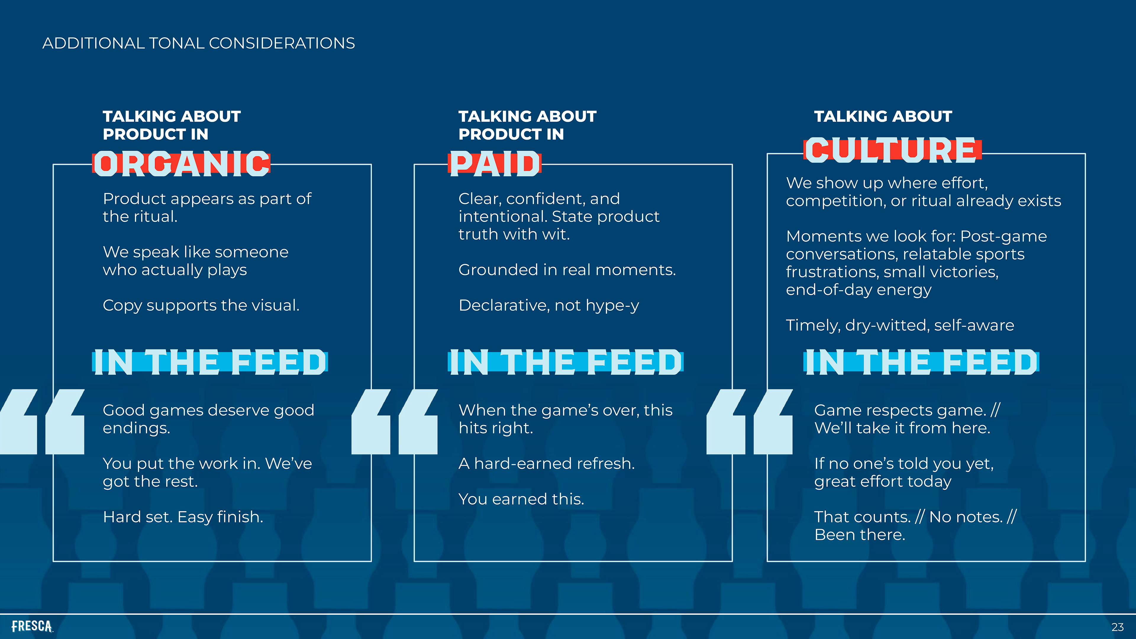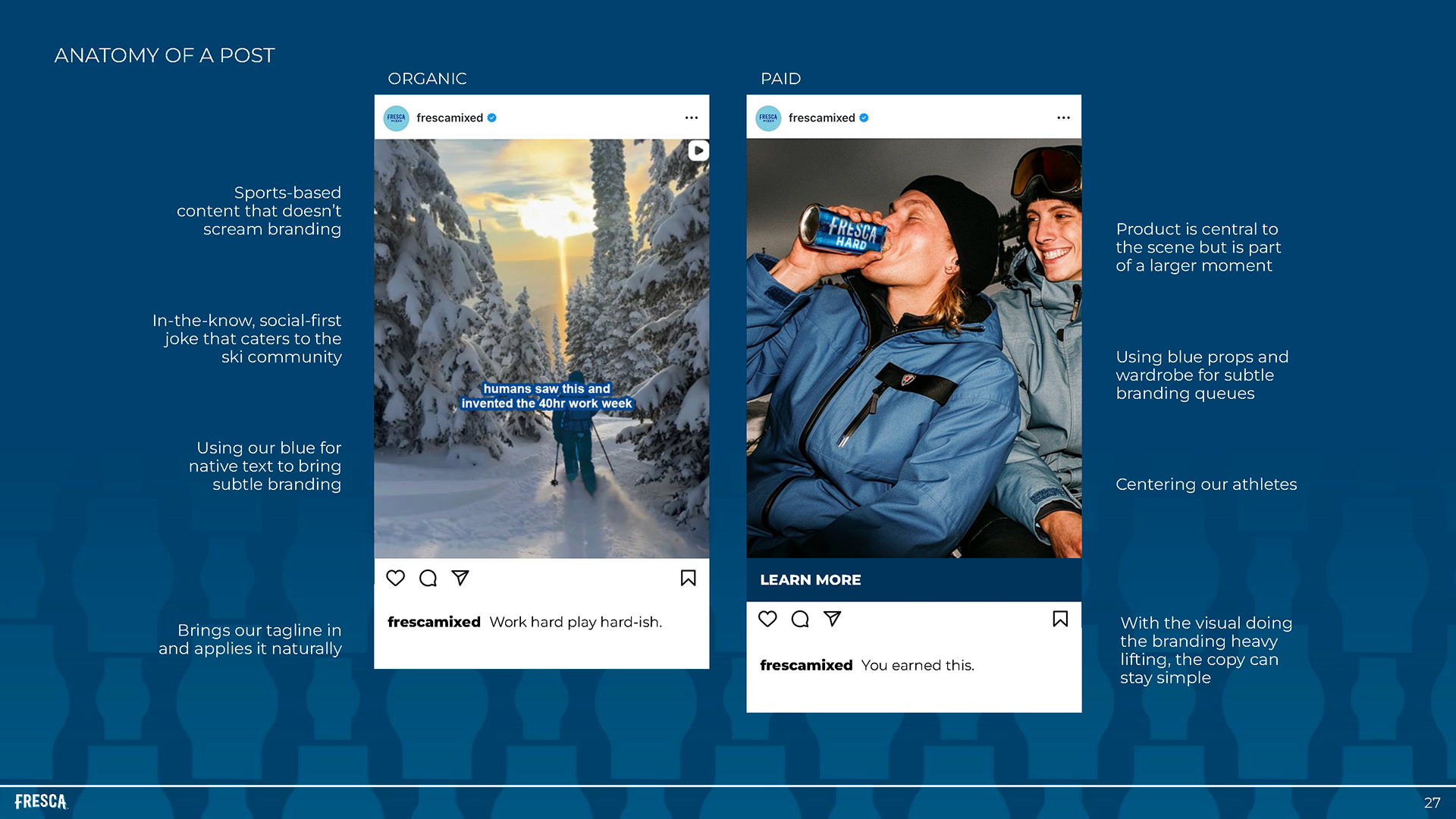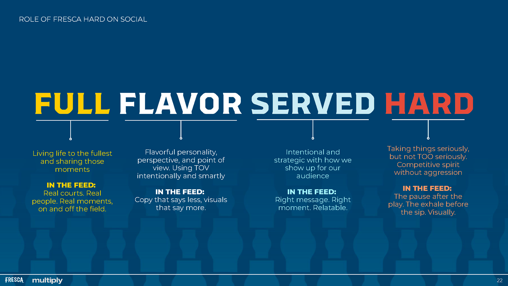 Launching Fresca Hard and continuing the reach of Fresca mixed required a new social strategy and tone of voice across visuals, how we approach and organize social, and copy. I hope this gives you an idea of how I approach design systems, visual continuity, social media, and communication across agencies.